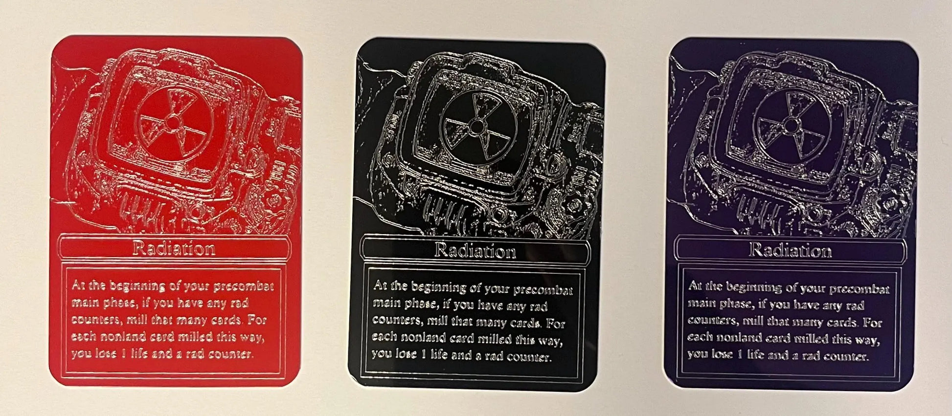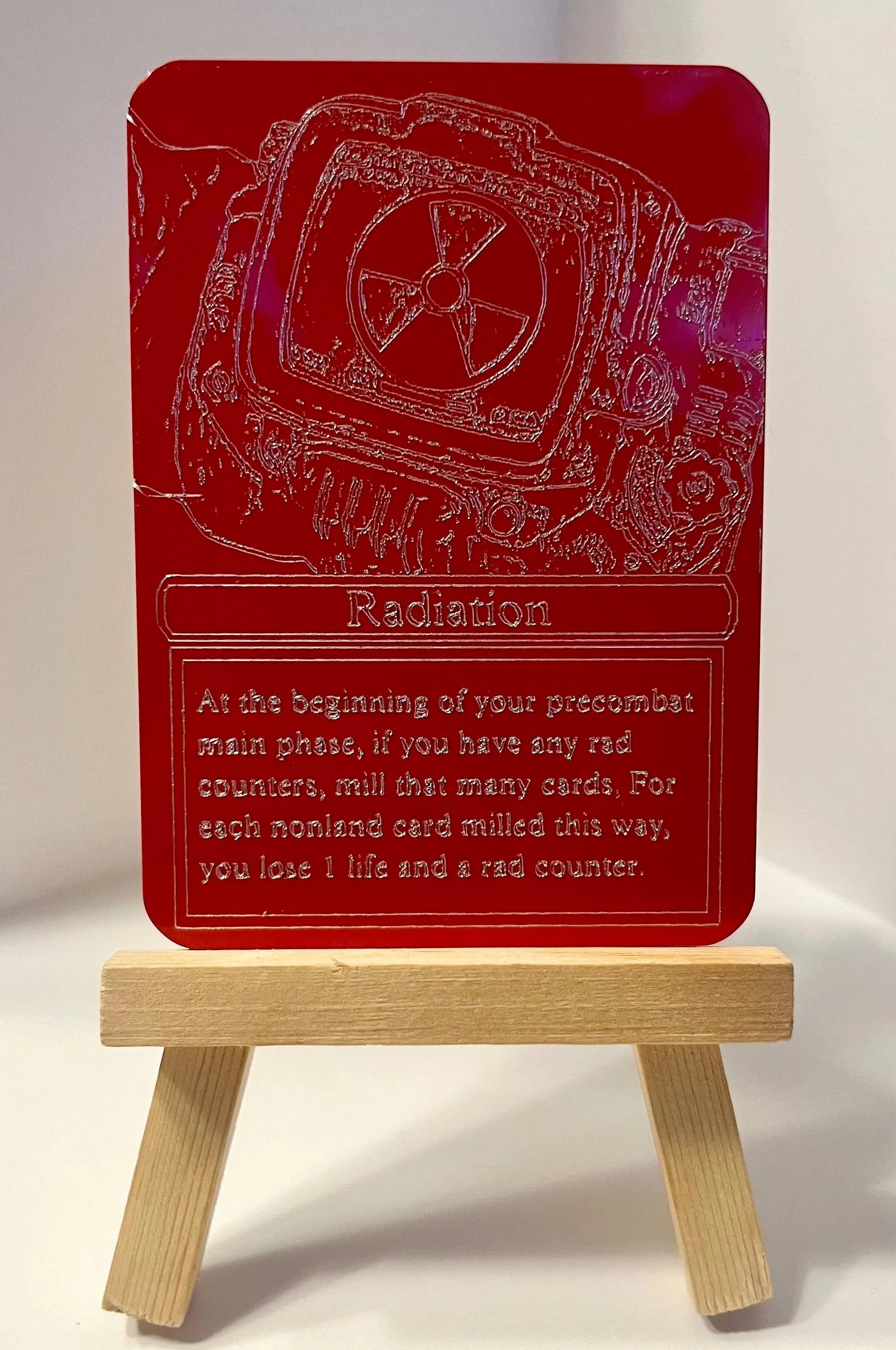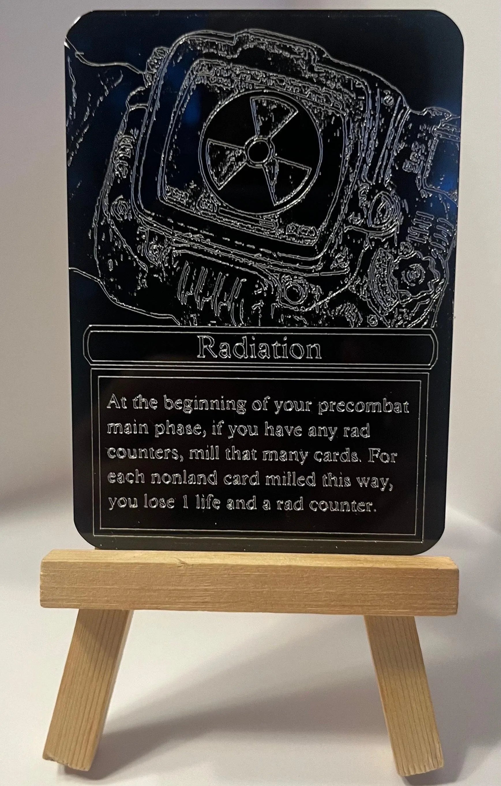 This token is etched into Aluminum and at exactly 2.5 by 3.5 it will fit perfectly into perfect fit sleeves and can be double sleeved as well. Don't forget to bring your Radaway!!
