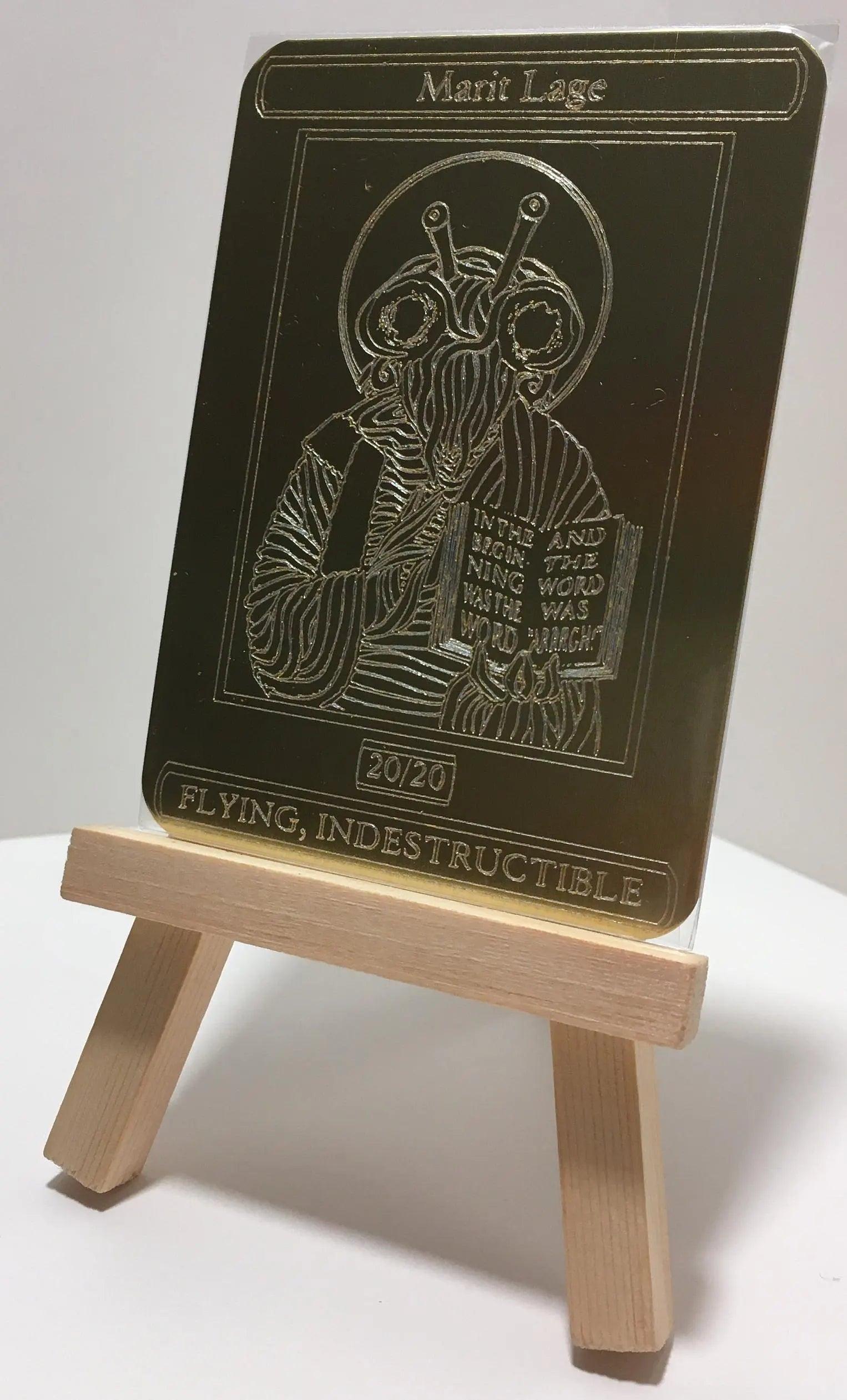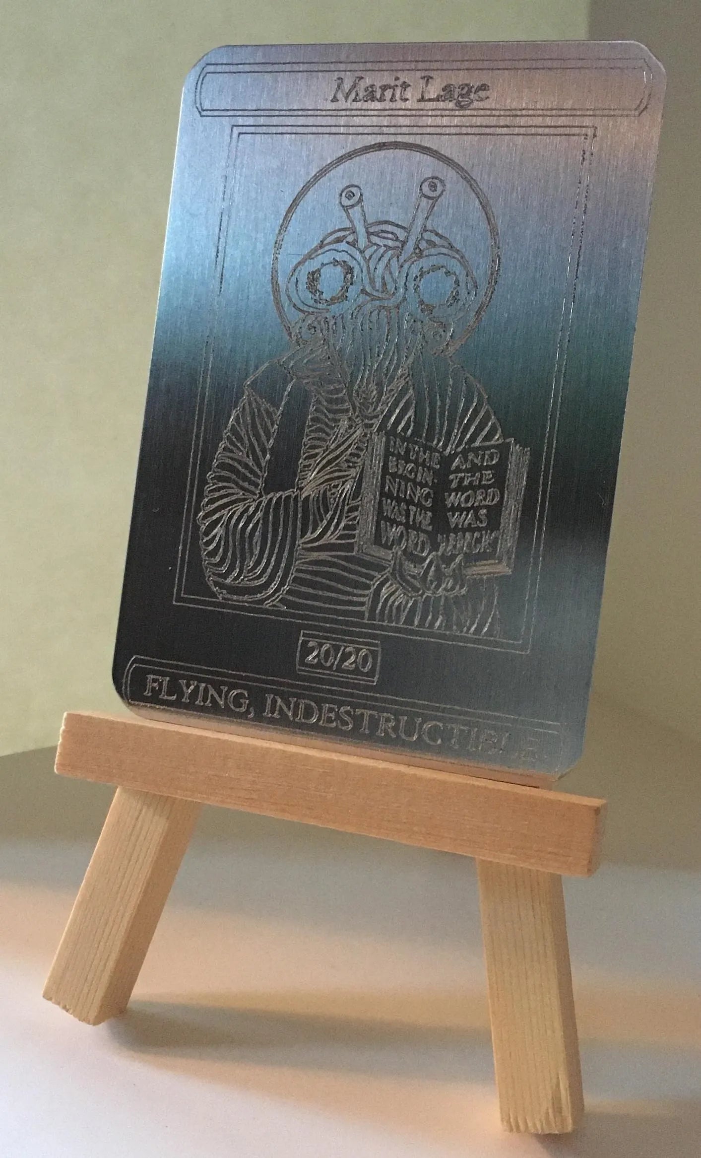 Pastafarians unite! This Marit Lage token shows an alternative take on our beloved from the darkest depths. The token measures 2.5" by 3.5" and fits perfectly into perfect fit sleeves, and can be double sleeved as well. Remember to pack your colander!!
